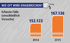Im Jahr 2015 verzeichnete die polizeiliche Kriminalstatistik wieder einen deutlichen Anstieg der Zahlen. Waren es im Jahr 2014 noch 152123 Aktionen, mussten 2015 insgesamt 167136 Einbrüche bzw. Einbruchsversuche erfasst werden – ein Anstieg von knapp 10%! Im 10-Jahresvergleich sind es fast 60% mehr Delikte als noch im Jahr 2006. Im Gegensatz dazu ist die Aufklärungsquote von knapp 16% (15,9 Prozent in 2014) auf 15,2% (2015) gesunken. Der von den Einbrechern verursachte Gesamtschaden lag bei 440,8 Millionen Euro.